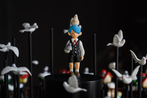 此外,他更為今次展覽首次設計藝術裝置,選取了 6 組寓言場景,延伸及製作了一個 1.8 米高的西洋鏡藝術裝置「流動蕃茄醬」;裝置共有3層,包括了過百件標有序號、造型不同的陶瓷雕塑作品,由籌備、3D 打印、人手著色到組裝,共花上 6 個月時間。裝置上具代表性的場景主角以16組定格動畫形式,配合閃燈與樂曲呈現,由靜止到轉動,像在把蕃茄醬高速搖動一樣。除了搪瓷徽章、刺繡T恤、明信片等限量精品,大家還可以選購喜歡的畫作及陶瓷雕塑帶回家!